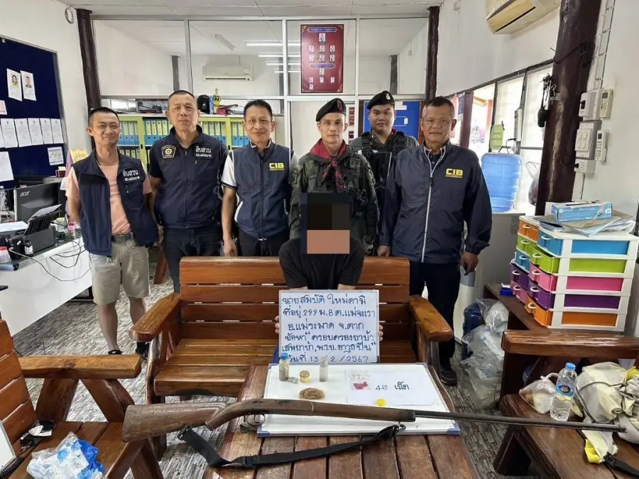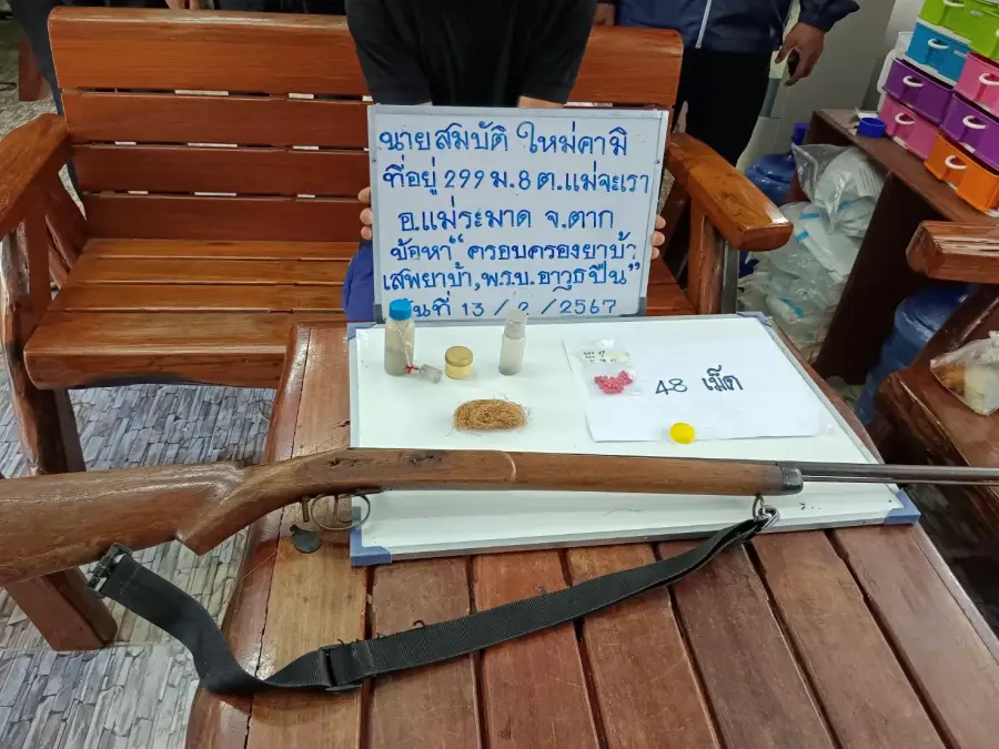 - สถานที่ตรวจค้น : บ้านเลขที่ 299 ม.8 ต.แม่จะเรา อ.แม่ระมาด จว.ตาก