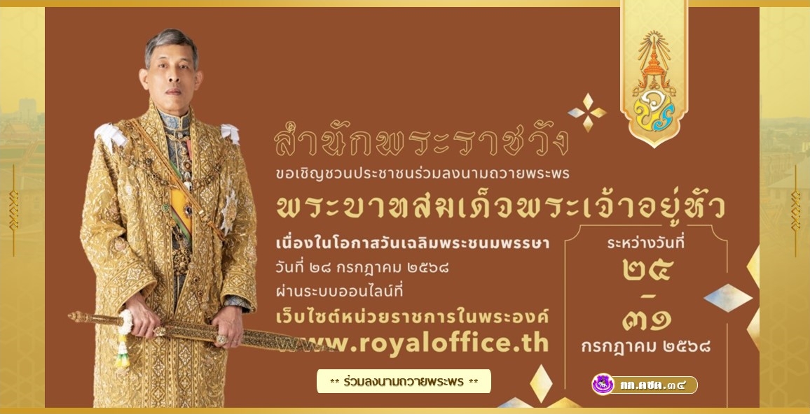 สำนักพระราชวัง ขอเชิญชวนประชาชนร่วมลงนามถวายพระพรชัยมงคล สมเด็จพระเจ้าอยู่หัว เนื่องในโอกาสวันเฉลิมพระชนมพรรษา วันที่ ๒๘ กรกฎาคม ๒๕๖๘ ผ่านระบบออนไลน์ ที่เว็บไซต์หน่วยราชการในพระองค์ www.royaloffice.th ระหว่างวันที่ ๒๕ – ๒๘ กรกฎาคม ๒๕๖๘
