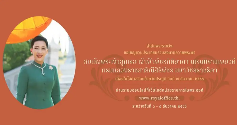 สำนักพระราชวัง ขอเชิญชวนประชาชนร่วมลงนามถวายพระพร สมเด็จพระเจ้าลูกเธอ เจ้าฟ้าพัชรกิติยาภา นเรนทิราเทพยวดี กรมหลวงราชสาริณีสิริพัชร มหาวัชรราชธิดา เนื่องในโอกาสวันคล้ายวันประสูติ วันที่ 7 ธันวาคม 2566 ผ่านระบบออนไลน์ ที่เว็บไซต์หน่วยราชการในพระองค์ www.royaloffice.th ระหว่างวันที่ 6 – 8 ธันวาคม 2566