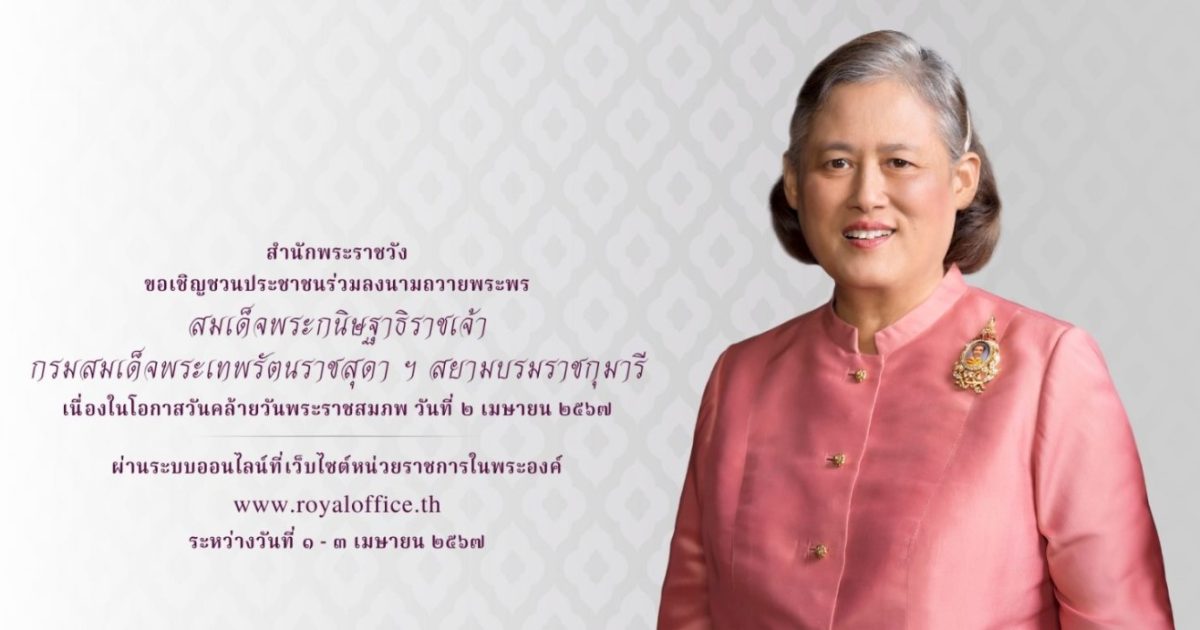 สำนักพระราชวัง ขอเชิญชวนประชาชนร่วมลงนามถวายพระพร สมเด็จพระกนิษฐาธิราชเจ้า กรมสมเด็จพระเทพรัตนราชสุดา ฯ สยามบรมราชกุมารี เนื่องในโอกาสวันคล้ายวันพระราชสมภพ วันที่ 2 เมษายน 2567 ผ่านระบบออนไลน์