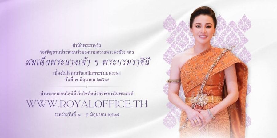สำนักพระราชวัง ขอเชิญชวนประชาชนร่วมลงนามถวายพระพรชัยมงคล สมเด็จพระนางเจ้า ฯ พระบรมราชินี เนื่องในโอกาสวันเฉลิมพระชนมพรรษา วันที่ ๓ มิถุนายน ๒๕๖๗ ผ่านระบบออนไลน์ ที่เว็บไซต์หน่วยราชการในพระองค์ www.royaloffice.th ระหว่างวันที่ ๑ – ๕ มิถุนายน ๒๕๖๗