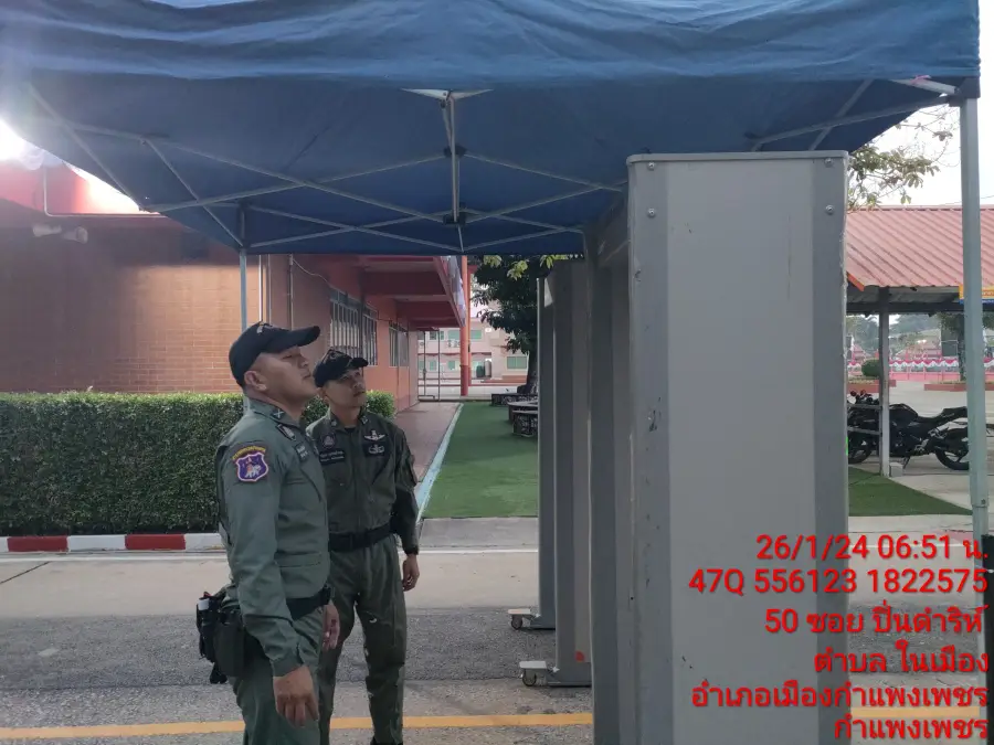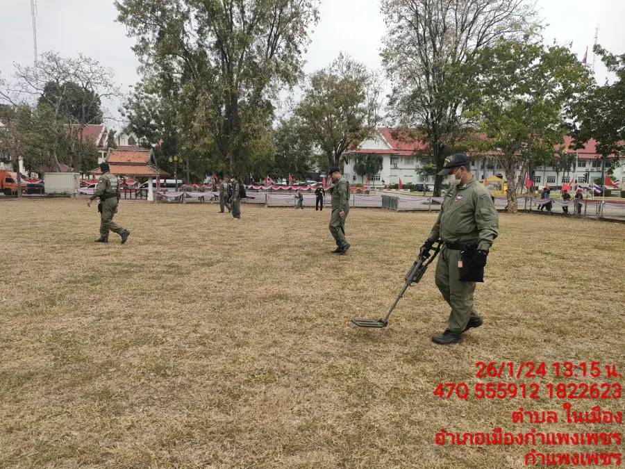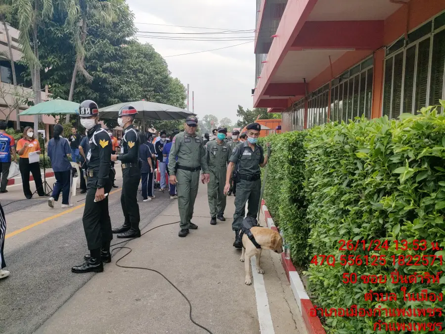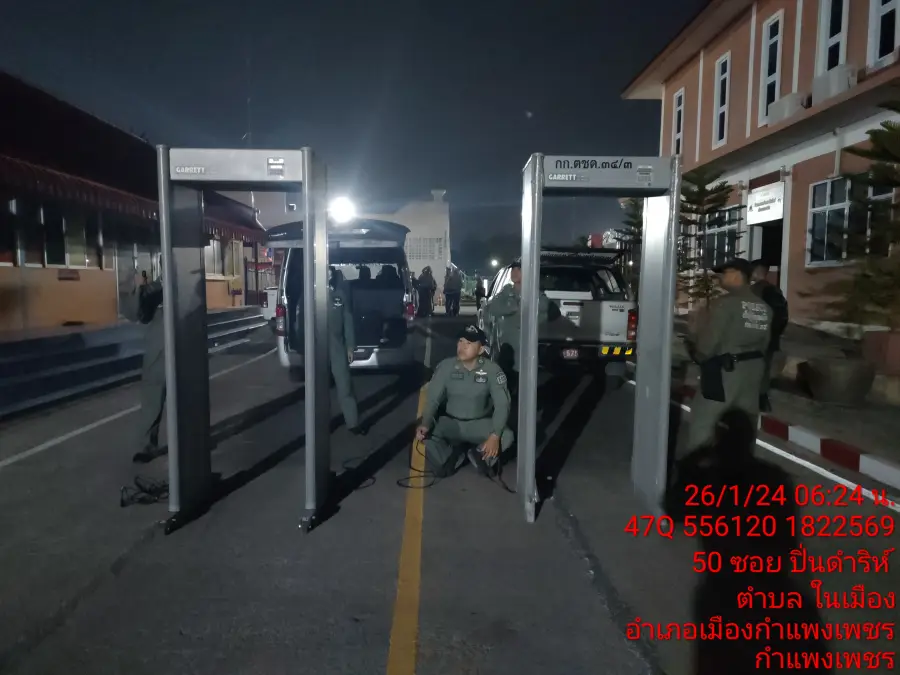 – เวลา 06.00 น.-15.30 น. ดำเนินการติดตั้งเครื่องตรวจโลหะแบบบุคคลเดินผ่าน (Walk Through) เพื่อคัดกรองบุคคลและตรวจค้น นักเรียน ข้าราชการ และประชาชน ณ วิทยาลัยเทคนิคกำแพงเพชร อ.เมือง จว.กำแพงเพชร