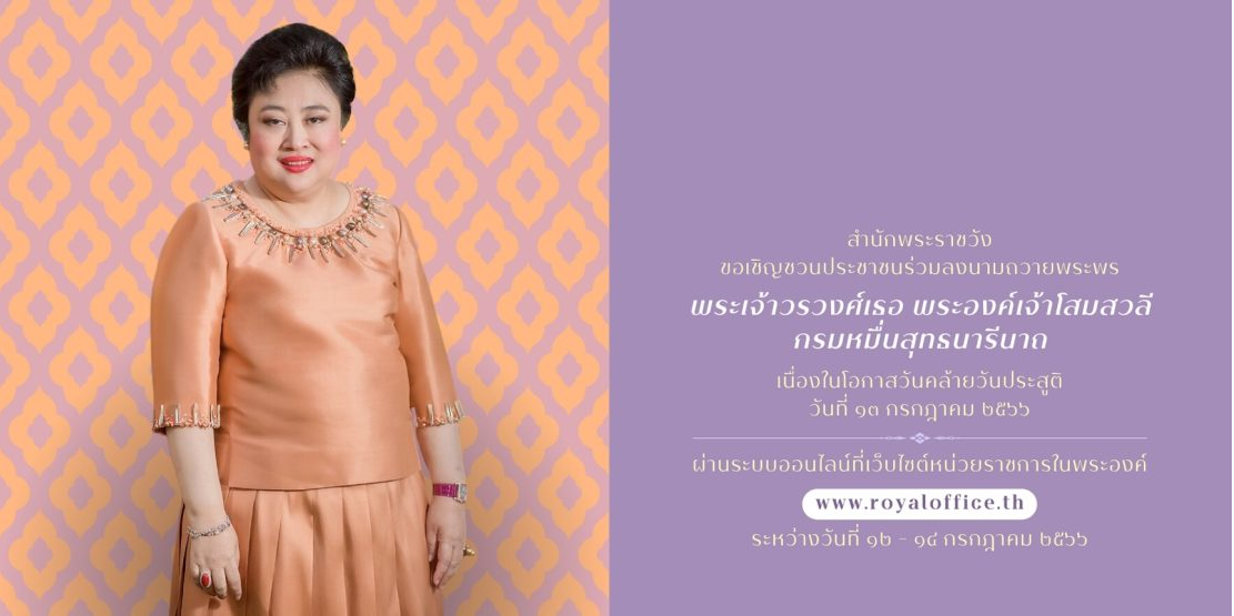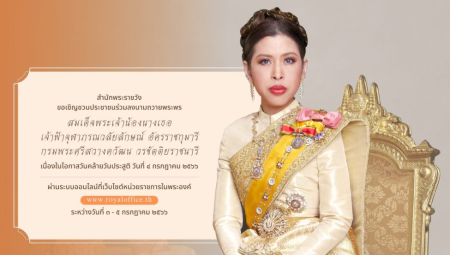 สำนักพระราชวัง ขอเชิญชวนร่วมลงนามถวายพระพร สมเด็จพระเจ้าน้องนางเธอ เจ้าฟ้าจุฬาภรณวลัยลักษณ์ อัครราชกุมารี กรมพระศรีสวางควัฒน วรขัตติยราชนารี เนื่องในโอกาสวันคล้ายวันประสูติ วันที่ 4 กรกฎาคม 2567 ผ่านระบบออนไลน์
